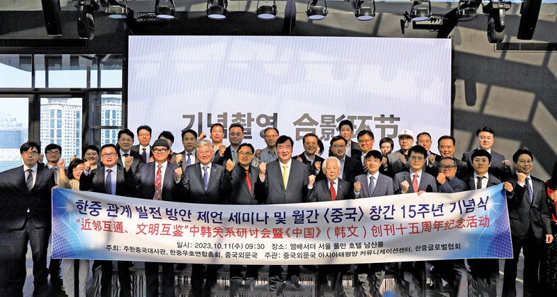 2023년 10월 11일 오전, 중국외문국, 주한 중국대사관, 한중우호연합총회가 주최하고 중국외문국 아시아태평양 커뮤니케이션센터와 한중글로벌협회가 공동 주관한 ‘중한 관계 발전 방안 제언 세미나 및 월간 <중국> 창간 15주년 기념식’이 한국 서울에서 개최됐다.