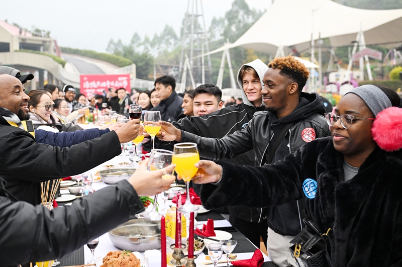 2024년 12월 21일, 외국인 관광객들이 충칭시 푸링(涪陵)구에 위치한 ‘메이신(美心) 와인 마을’에서 성찬으로 마련된 장탁연(長桌宴, 긴 식탁 연회)을 즐기고 있다. 사진/CNSPHOTO