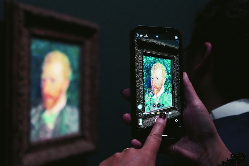 상하이 푸둥 미술관에서 열린 ‘근대를 창조하다: 파리 오르세 미술관에서 온 예술 보물’ 전시를 찾은 관람객이 휴대전화로 고흐의 <자화상>을 촬영하고 있다. 사진/CNSPHOTO