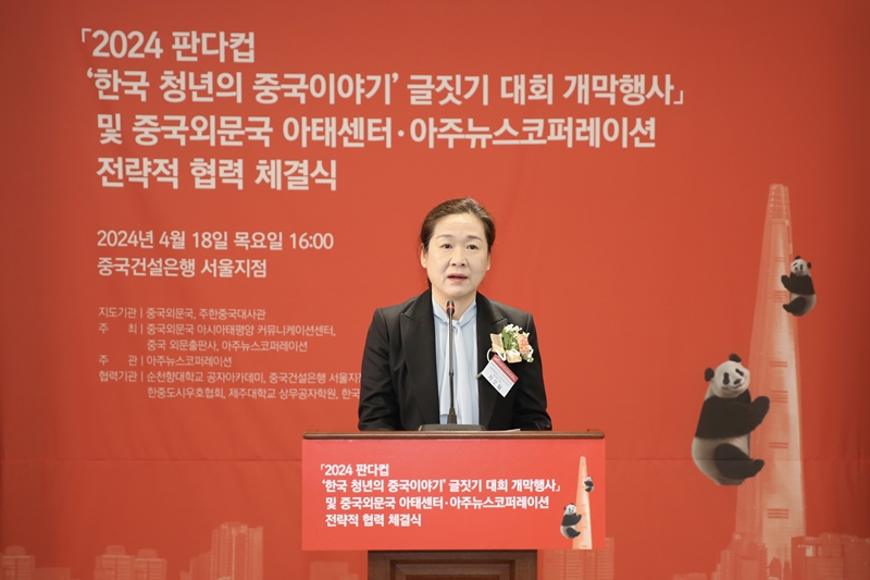 자추야 중국 외문출판사 부사장이 2024 판다컵 글짓기 대회 개막행사를 진행하고 있다.