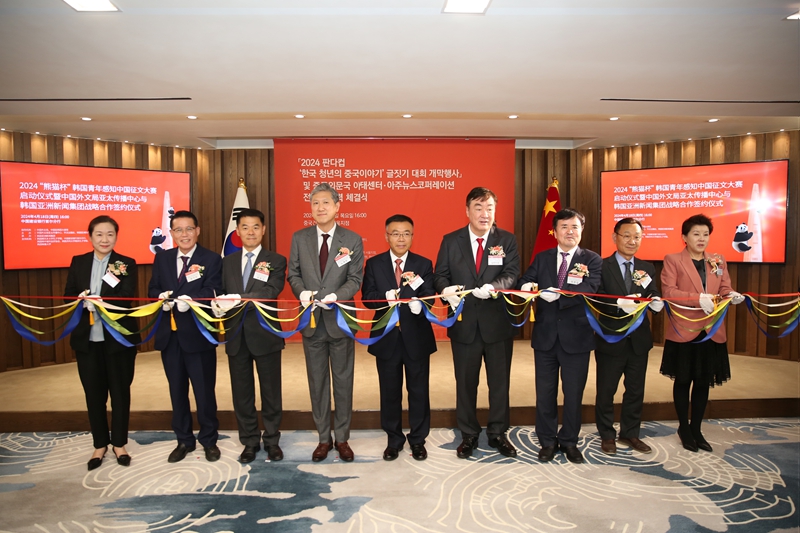 2024 판다컵 ‘한국 청년의 중국이야기’ 글짓기 대회 개막을 기념해 참석자들이 테이프 커팅식을 하고 있다.