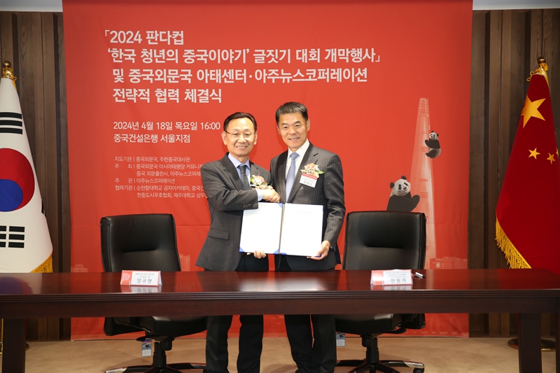 한편 이날 행사에서 중국외문국 아시아태평양 커뮤니케이션센터와 아주뉴스코퍼레이션은 전략적 협력을 체결했다. 천원거 중국외문국 아시아태평양 커뮤니케이션센터 주임과 양규현 아주일보 사장이 양측을 대표해 합의문에 서명했다.