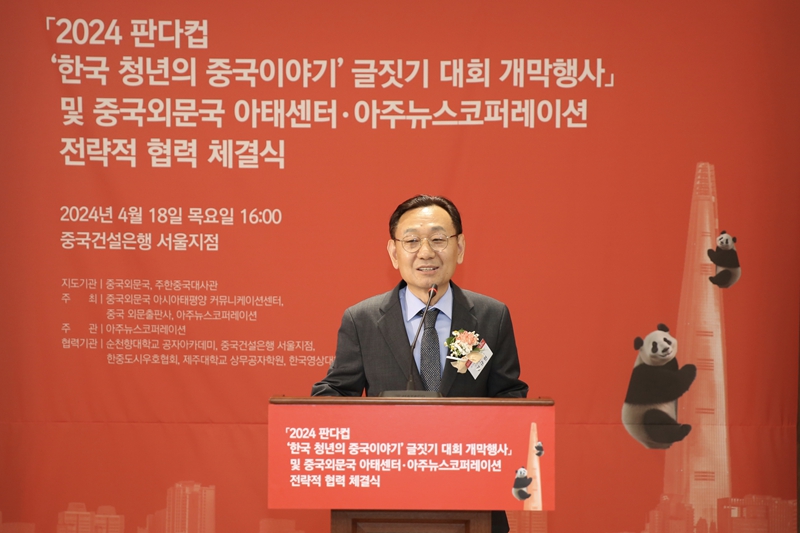 2024 판다컵 ‘한국 청년의 중국이야기’ 글짓기 대회 개막행사가 4월 18일 오후 한국 서울에서 열렸다. 이 자리에는 류다웨이(劉大為) 중국외문국 부국장을 비롯해 싱하이밍(邢海明) 주한중국대사, 노재헌 동아시아문화센터 원장, 곽영길 아주뉴스코퍼레이션 회장, 자오화(趙華) 순천향대학교 공자아카데미 중국측 원장, 천원거(陳文戈) 중국외문국 아시아태평양 커뮤니케이션센터 주임, 양규현 아주일보 사장, 왕위제(王玉潔) 중국건설은행 서울지점 대표, 권기식 한중도시우호협회 회장, 장뤄위(張若愚) 중국 주서울관광사무소 주임 등 중한 내외 귀빈과 역대 수상자, 양국 기자단 등 50여 명이 행사에 참석했다. 이날 개막 행사는 자추야(賈秋雅) 중국 외문출판사 부사장이 진행을 맡았다.