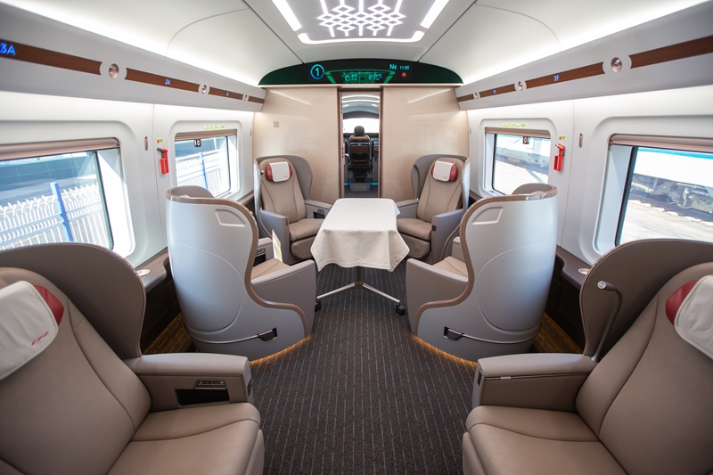 CR450 객실 내부는 세련된 소재와 색상, 디자인이 적용돼 아늑하고 고급스러운 분위기를 연출한다. 또 구역별 좌석 배치와 넉넉한 공간 설계를 통해 안락함을 극대화했다. 사진은 CR450 비즈니스석의 모습이다.