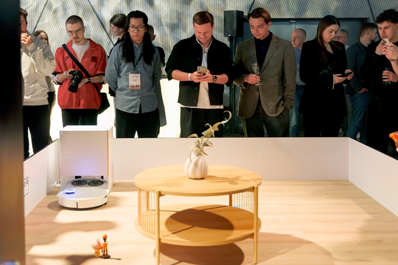 드리미의 폴란드 신제품 발표회 현장에서 참석자들이 부스에 전시된 로봇청소기 시연을 유심히 지켜보고 있다.