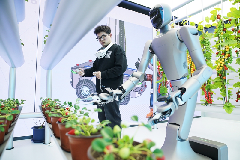 지난 3월 10일, 허난(河南)성 과학원의 스마트 실험실에서 한 연구원이 로봇의 동작 훈련을 진행하고 있다. 사진/IC