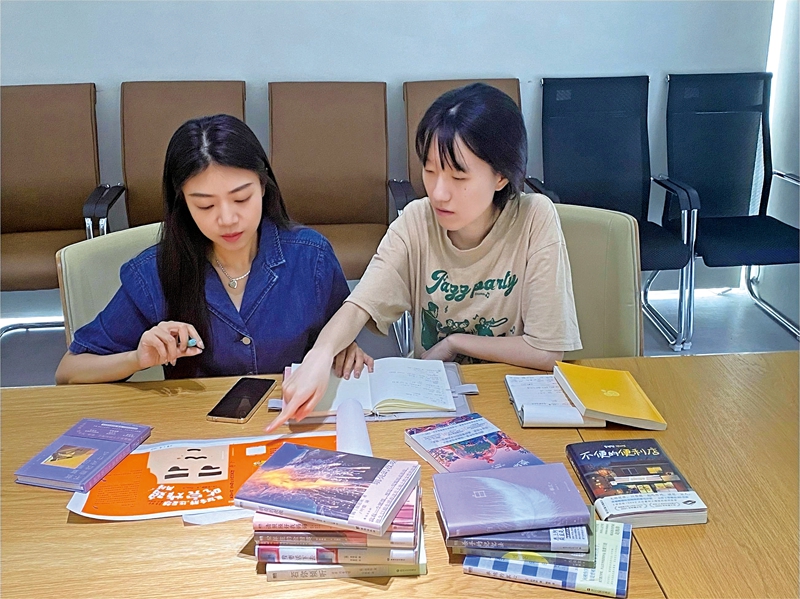 왕우디(왼쪽)와 동료가 회사 회의실에서 한국 도서에 대해 토론을 하고 있다. 사진/왕우디 본인 제공