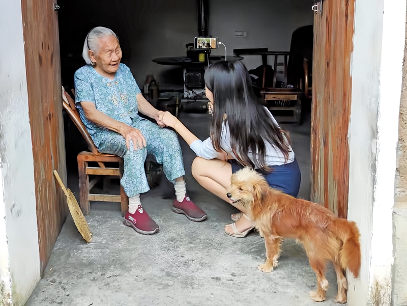 진영은은 매일 영상을 촬영한다. 사진은 진영은이 후베이(湖北)성 이창(宜昌)시 위안안(遠安)현 룽펑(龍鳳)마을에서 100세 어르신을 인터뷰하고 있는 모습이다. 사진/진영은 본인 제공