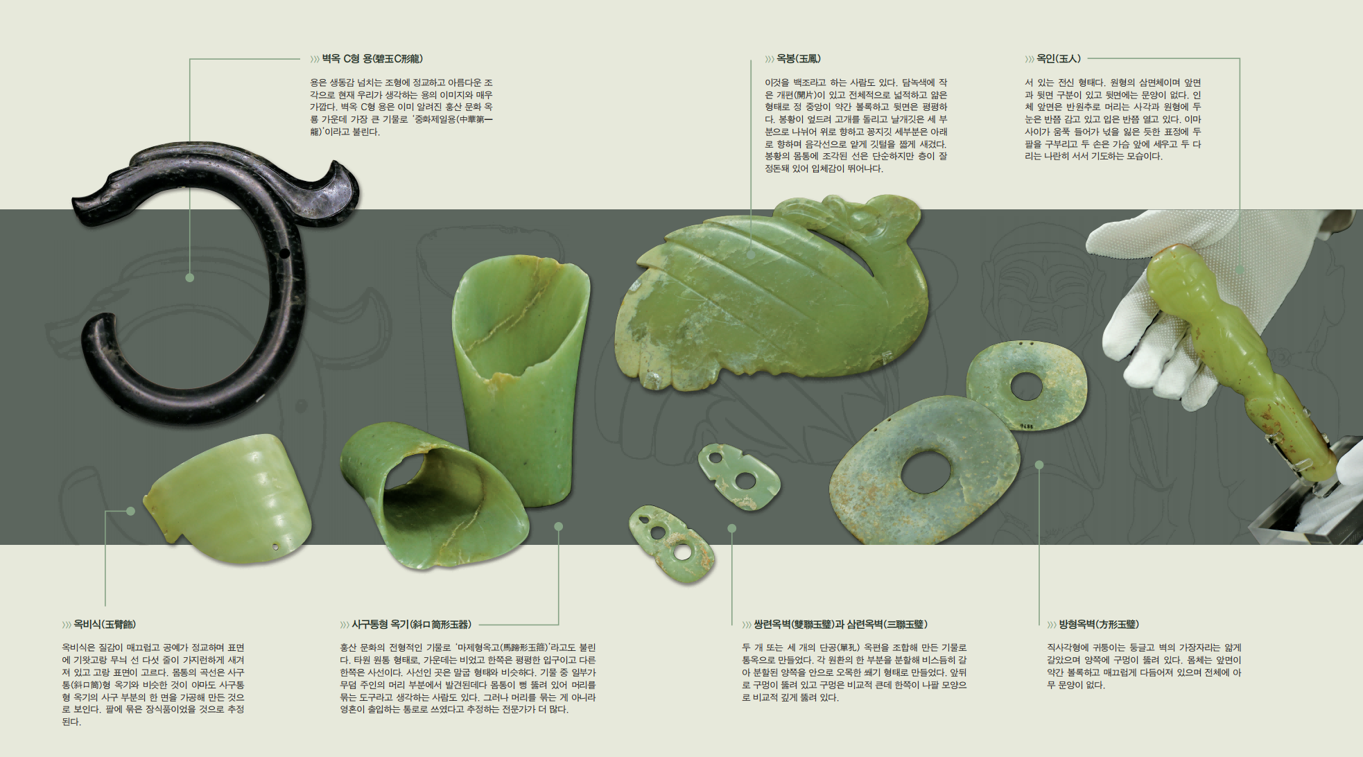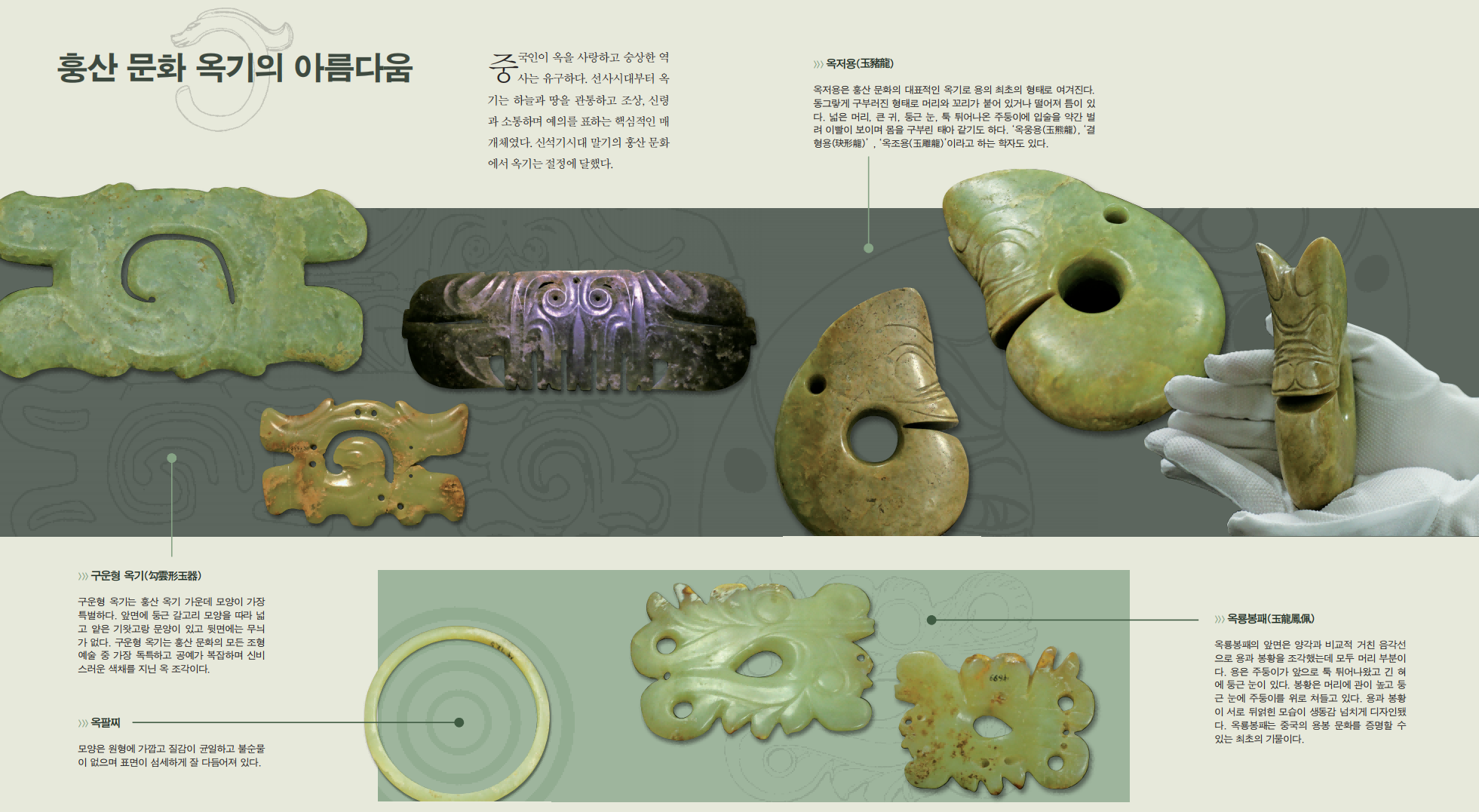 중국인이 옥을 사랑하고 숭상한 역사는 유구하다. 선사시대부터 옥기는 하늘과 땅을 관통하고 조상, 신령과 소통하며 예의를 표하는 핵심적인 매개체였다. 신석기시대 말기의 훙산 문화에서 옥기는 절정에 달했다.