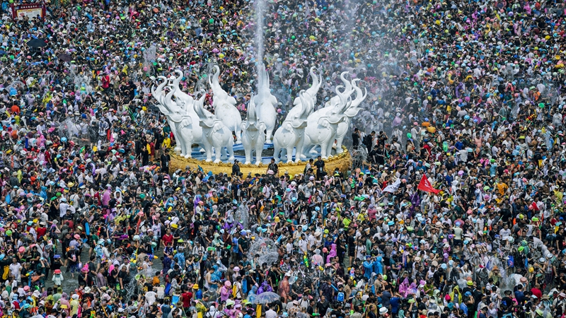 지난 4월 15일 윈난(雲南)시솽반나(西雙版納) 징훙(景洪)시 포수이광장에서 다이리(傣歷, 중국 태족이 사용하는 역법) 1386년 새해를 맞아 워터밤 행사가 개최됐다. 사진/VCG