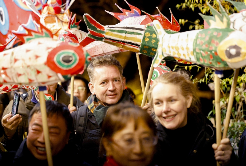 2024년 12월 26일, 네덜란드 관광객이 안후이(安徽)성 황산(黃山)시 시시난(西溪南) 고촌에서 어등(魚燈) 퍼레이드를 체험하고 있다. 사진/VCG