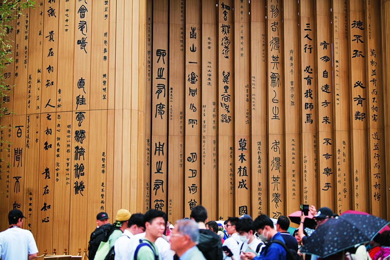‘중화서간(中華書簡)’은 2025 오사카·간사이 엑스포(이하 오사카 엑스포) 중국관의 이름이다. 이 건축물은 대나무, 한자, 서권(書卷, 두루마리 형태의 고서) 세 가지 요소를 조화롭게 결합해 ‘도법자연(道法自然), 천인합일(天人合一)’이라는 수천 년 동안 전해 내려온 중화문명의 지혜를 생생하게 표현한다. 전시관 외관에는 금문(金文), 전서(篆書), 예서(隸書), 행서(行書), 해서(楷書) 다섯 가지 서체로 119개의 한자 시구와 명문이 새겨져 있어 문화의 보고라고 할 수 있으며 관람객들은 이곳에서 방대하고 심오한 중화 문화를 느낄 수 있다.