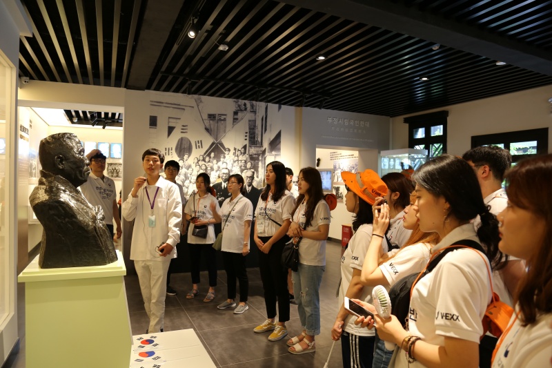 2019년 7월 9일, 한국 학생단이 충칭 대한민국 임시정부 청사 전시관을 방문해 전시 설명을 경청하고 있다.