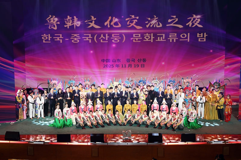 최근 중국과 한국에서 다양한 양국 교류 행사가 잇따라 개최되고 있다. 지난 11월 19일부터 22일까지, ‘한국과 산둥(山東)의 만남, 상생과 번영의 미래로’라는 주제로 2025 중국(산둥)-한국 우호 주간 행사가 중국 산둥 지난(濟南)과 칭다오(靑島)에서 개최됐다. 사진은 문화교류의 밤 행사가 끝나고 내빈들과 공연 출연자들이 함께 기념 촬영을 하고 있는 모습이다. 사진/리위안중(李元忠)