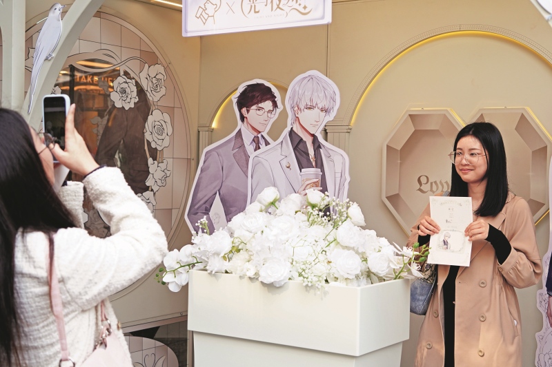 한 시민이 시차와 모바일 게임 <빛과 밤의 사랑> 컬래버 이벤트 현장에서 인증샷을 찍고 있다. 사진/VCG