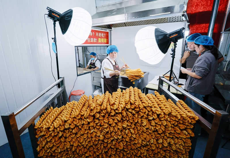 산시(山西)성 윈청(運城)시 완룽(萬榮)현의 한 식품 가공 기업이 전자상거래 플랫폼을 활용해 라이브 방송으로 마화(麻花, 밀가루 반죽을 꼬아 튀긴 과자)를 홍보하고 있다. 사진/VCG