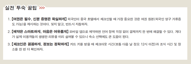 중국 고속철도의 편리함을 느껴봤으니, 이제 여행에서 빼놓을 수 없는 ‘호텔 체크인’에 대해 알아보자. 안락한 숙소는 여행의 만족도를 결정짓는 중요한 요소 중 하나다. 철저하게 미리 준비한 여행이든, 발길 닿는 대로 떠나는 즉흥적 여행이든 상관없다. 이번 편에서는 모바일 앱을 통해서 예약하는 방법부터 프런트 데스크 체크인까지, 전 과정을 막힘없이 진행할 수 있는 실전 가이드와 핵심 중국어 표현을 알차게 담았다.
